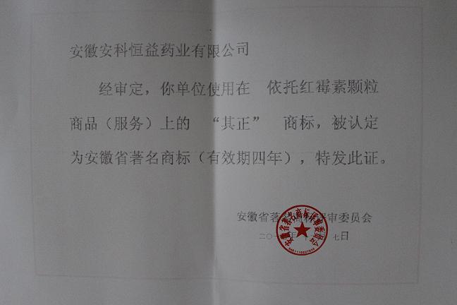 近日,公司收到《2017年安徽省著名商標(biāo)認(rèn)定公告》,公司產(chǎn)品依托紅霉素顆粒其商標(biāo)“其正”經(jīng)安徽省著名商標(biāo)評(píng)審委員會(huì)評(píng)審?fù)ㄟ^,認(rèn)定為“安徽省著名商標(biāo)”。該商標(biāo)是我公司取得的第三件省著名商標(biāo)(前兩件分別是“天井”牌氨咖黃敏膠囊、恒迪克牌頭孢克洛分散片)。