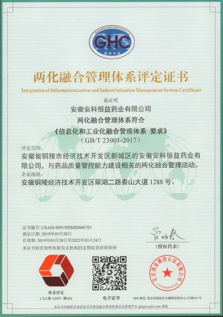 近日,安科恒益兩化融合管理體系貫標(biāo)及申請(qǐng)的“與藥品質(zhì)量管控能力建設(shè)”的兩化融合管理活動(dòng)獲頒國家級(jí)“兩化融合管理體系評(píng)定證書”,并獲得國家兩化融合管理體系評(píng)定機(jī)構(gòu)和工信部?jī)苫诤瞎芾眢w系專家組的一致認(rèn)可。