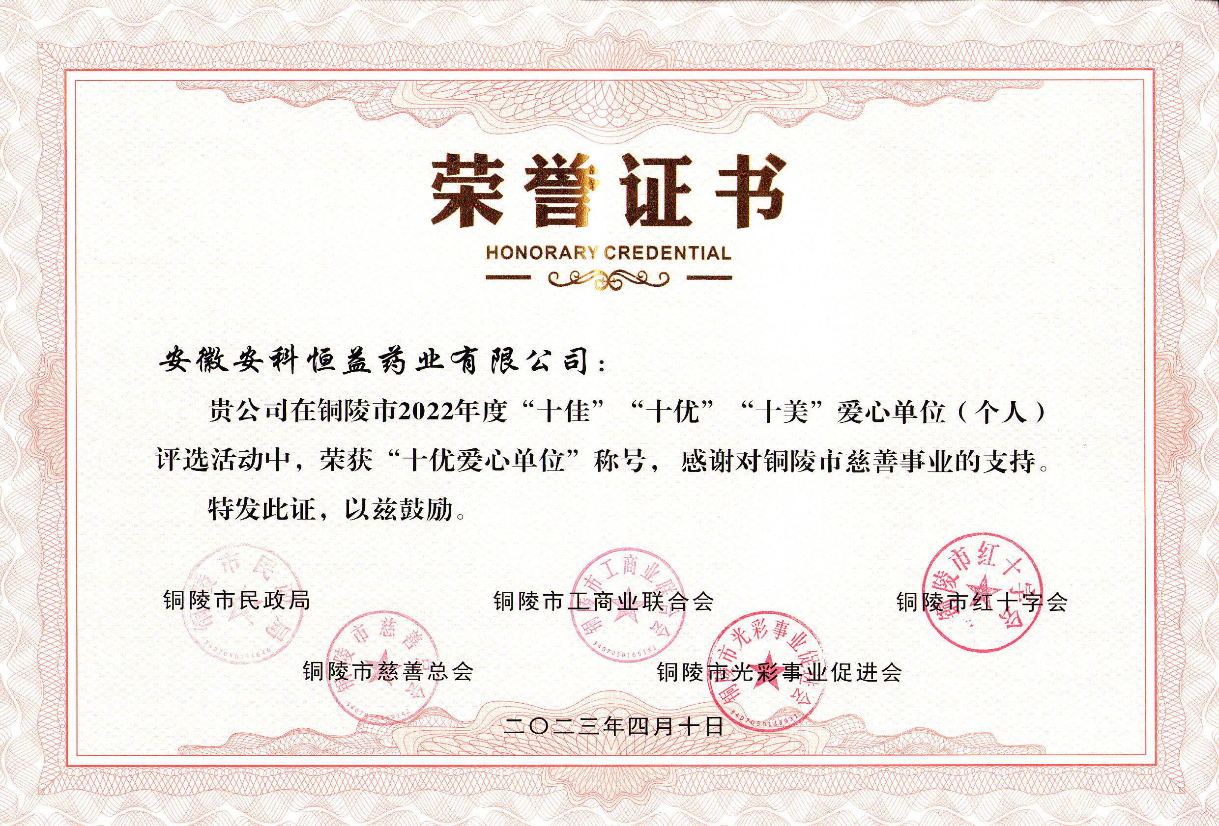 近日,我公司收到銅陵市“十優(yōu)愛心單位”稱號(hào)榮譽(yù)證書。